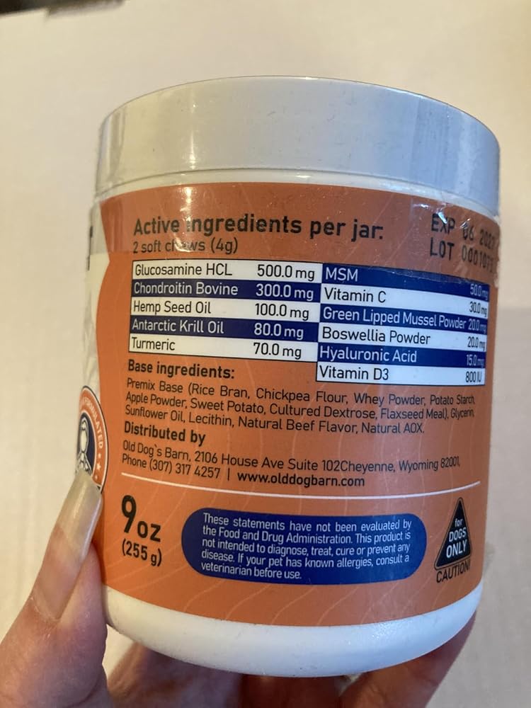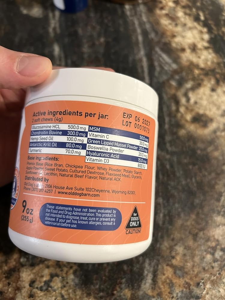 I just started giving these hip and joint chews to my dog, so it’s too soon to say whether they’ll make a big difference. The good news is that there’s been no bad reaction—he eats them without fuss, and they don’t seem to upset his stomach.The formula has a lot of the right ingredients you’d hope for in a joint supplement—glucosamine, chondroitin, MSM, krill oil, green-lipped mussel, and Omega-3s—all things that support joint health and mobility in older dogs. I think it’s going to take some time before I know how effective they really are, but so far, there’s no harm in trying, and they seem like a solid daily supplement.