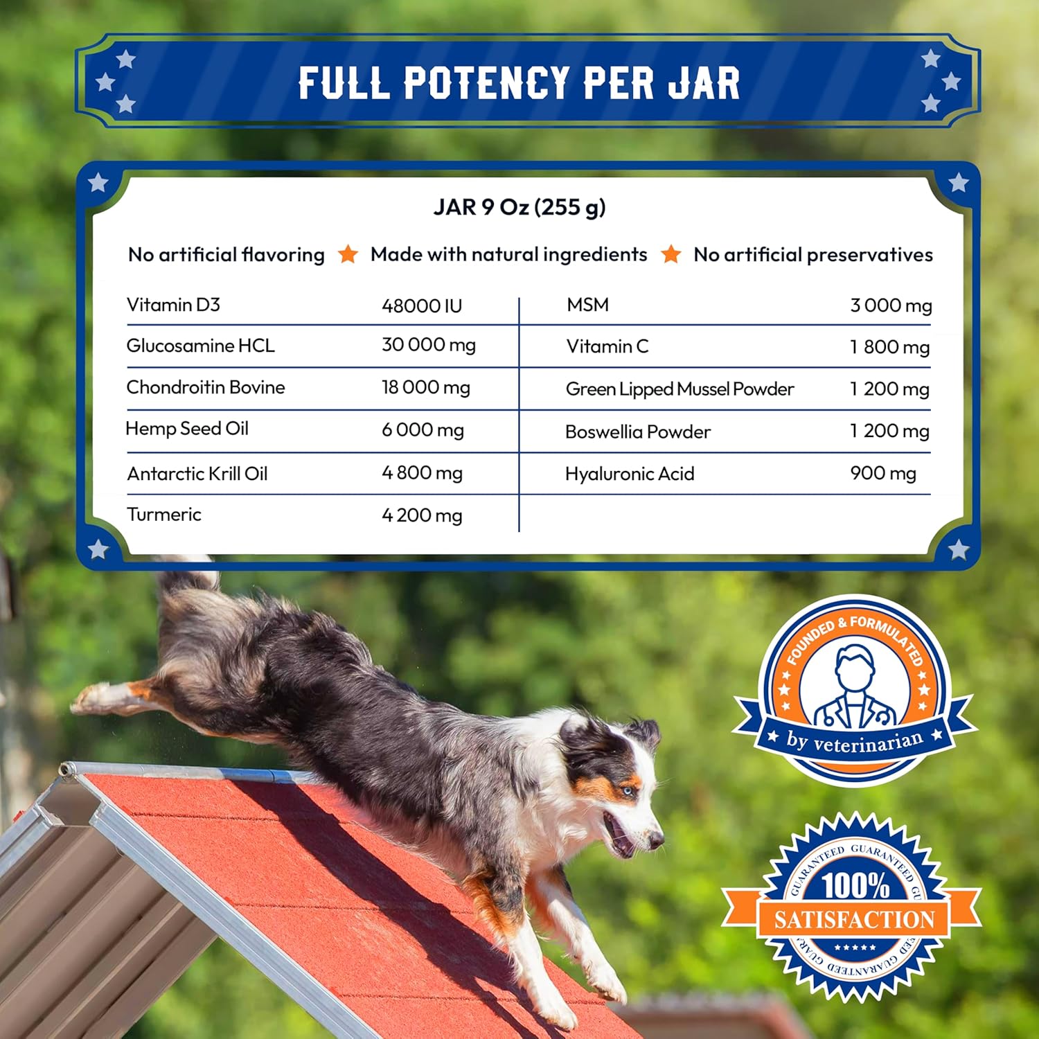 *As your furry friend enters their golden years, their needs evolve, especially when it comes to maintaining their joint health and overall mobility. This exceptional joint supplement is specifically crafted to provide the necessary support for older dogs who may be experiencing age-related joint challenges. Designed with love and care, this powerful formula helps to keep your pet active, comfortable, and full of life—allowing you to share precious moments together for years to come. This carefully formulated solution addresses the common concerns of pet parents who want to ensure their canine companions can enjoy vital activities like running, playing fetch, and exploring the great outdoors without discomfort. It’s perfect for devoted dog owners who prioritize the health and happiness of their loyal companions, all while seeking a natural and effective way to enhance their quality of life. Key features abound in this advanced joint supplement. The blend includes high-quality **Glucosamine** (30,000 mg per jar) and **Chondroitin** (18,000 mg) that work synergistically to promote cartilage repair and maintain healthy joint function. These essential ingredients help reduce stiffness and discomfort, making it easier for your dog to move freely and comfortably. Including **MSM** (3,000 mg), a natural ingredient recognized for its anti-inflammatory benefits, this supplement assists in alleviating pain and improving joint flexibility, which is crucial for a vibrant, playful dog. The incorporation of premium **Antarctic Krill Oil** and **Hemp Seed Oil** offers unmatched support through essential fatty acids, which not only aid joint health but also contribute to a shiny coat and overall well-being. To ensure maximum mobility, this formula harnesses the advantages of **Hyaluronic Acid** and **Turmeric**, known for their abilities to enhance joint mobility and support ease of movement—your dog will be bouncing around with the same enthusiasm as when they were a puppy! Enriched with generous amounts of **Vitamin D** (48,000 IU) and **Vitamin C** (1,800 mg), this supplement plays a vital role in fortifying your dog’s bones and boosting their immune system. With this nutritional powerhouse, your furry companion will be ready for their next adventure, ensuring they stay vigorous and healthy. What’s more, convenience is key. Each 9 oz jar contains 120 scrumptious bacon-flavored chews, turning supplementation into a delightful daily treat your dog will love. No complicated dosing instructions—just pop a chew into their bowl and watch them savor it! Quality matters when it comes to caring for your beloved pet, and this formula stands out in a crowded market. Vet-formulated with high-potency doses, it promises visible results that many other supplements simply can’t deliver. Every ingredient is natural and devoid of artificial additives and preservatives, making this solution not just effective, but a wholesome choice for your cherished companion. By choosing this joint supplement, you’re not just investing in a product; you’re gifting your dog the joy of comfortable mobility and renewed energy. Watch as their spirit shines, and every wag of their tail represents the happiness and health they deserve. Make the right choice for your furry friend today and empower them to seize the joy of life once again!